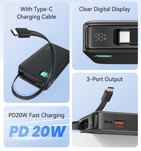 Pin Sạc Dự Phòng Tích Hợp Cáp Dây Rút Type-C USAMS CD224 10000mAh 20W (Digital Display)