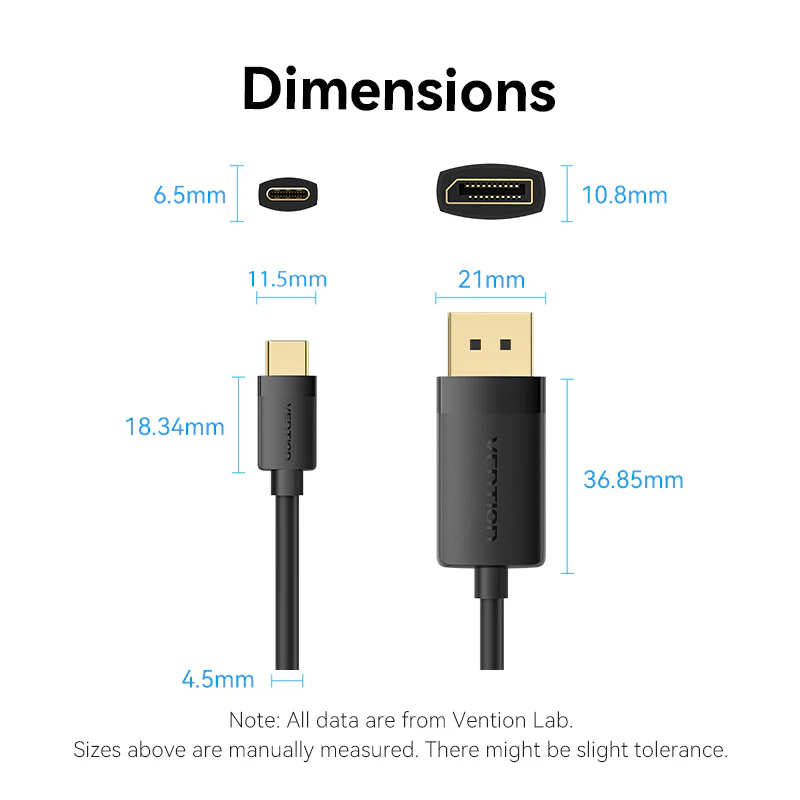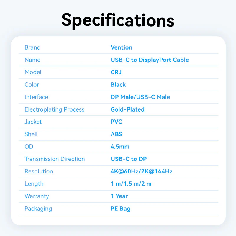 Cáp Chuyển Type-C to DisplayPort VENTION CRJ 4K (1m, 4K@60Hz / 2K@144Hz, HDCP 2.2, Audio & Video In Sync, 3D Visual Effect)