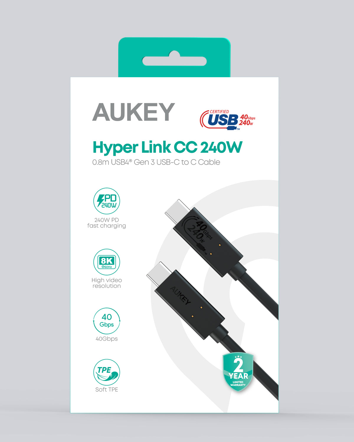Cáp Sạc Nhanh C to C AUKEY CB-TCC241 240W (8K@60Hz, USB4, USB-IF certified, 40Gbps, 0.8m)
