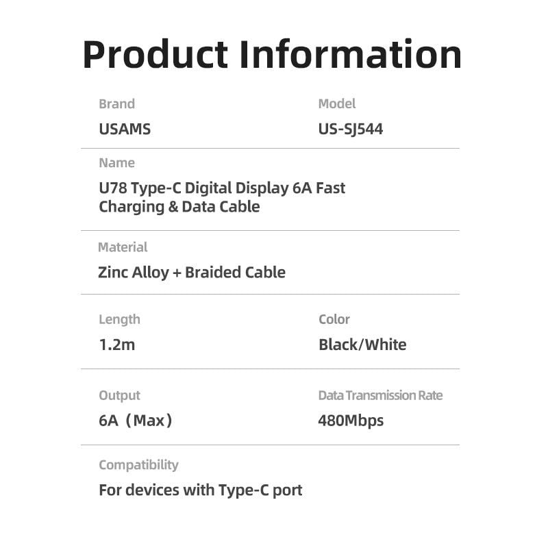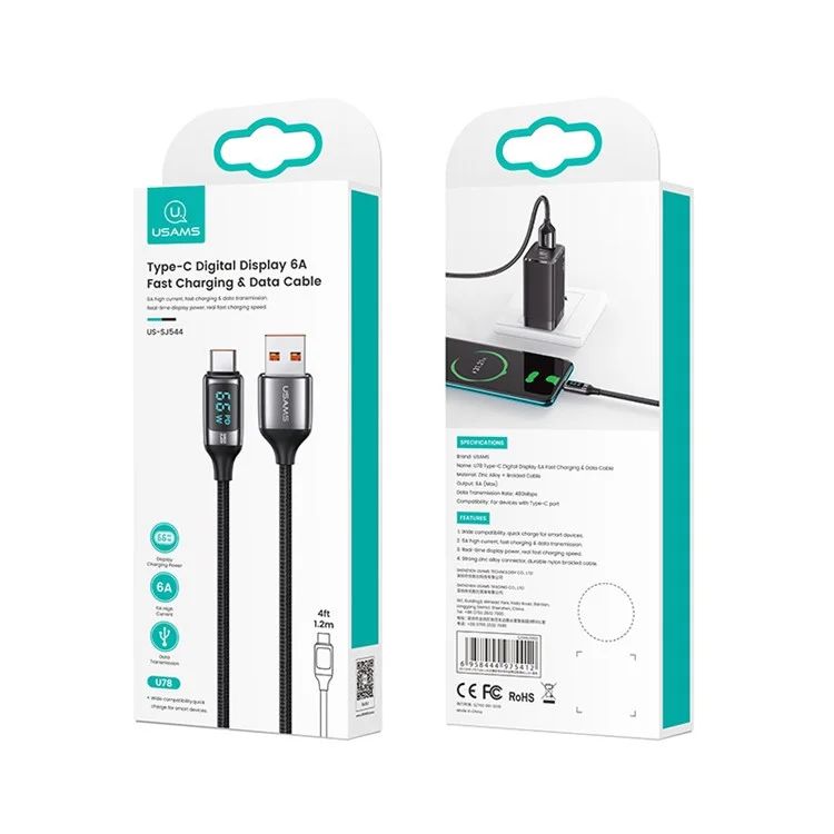 Cáp Sạc Nhanh Màn Hình Kỹ Thuật Số USAMS SJ544 U78 1.2m Type-C 6A
