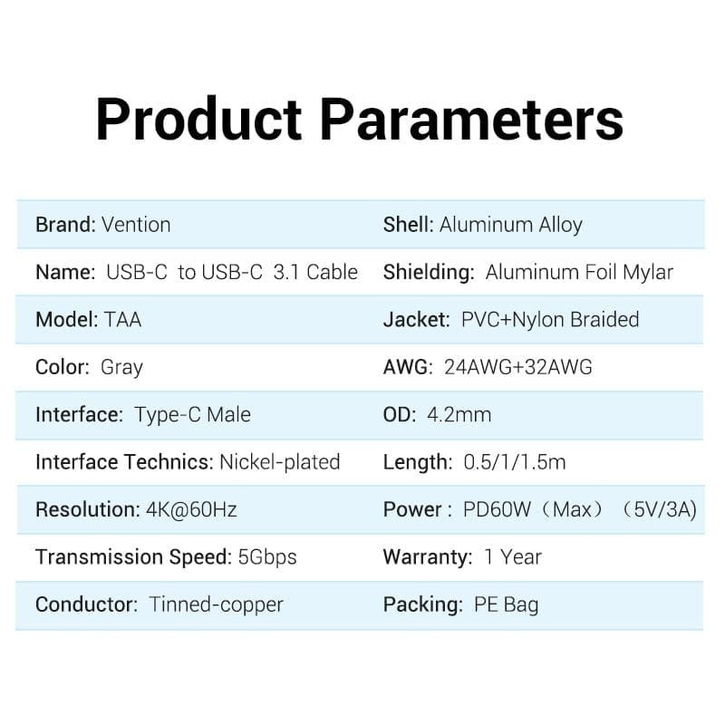 Cáp Sạc Nhanh VENTION USB 3.1 C to C TAAHF (3A/60W, 4K, Cotton Braided)