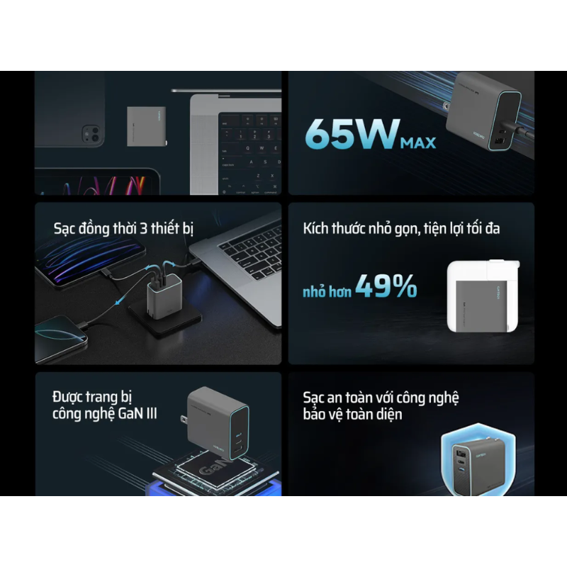 Củ Sạc Nhanh CUKTECH A15C 65W (2*Type-C + 1*USB-A port, with 1.5m C to C 5A cable)