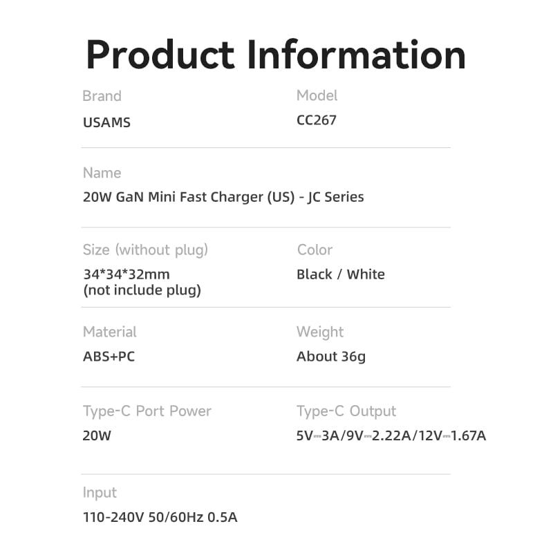 Củ Sạc Nhanh USAMS CC267 20W (GaN Charger)