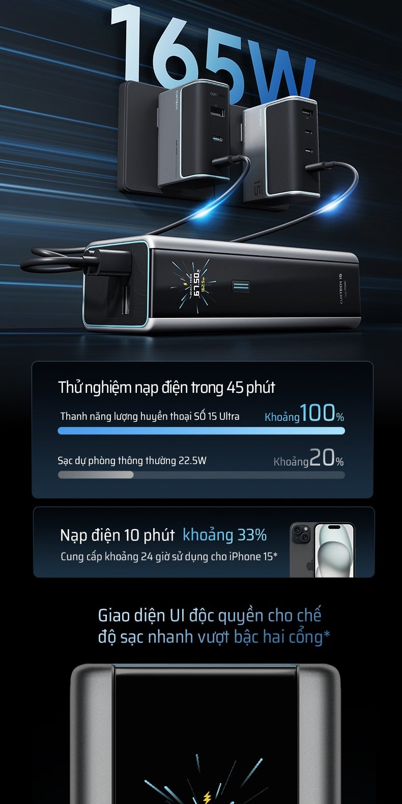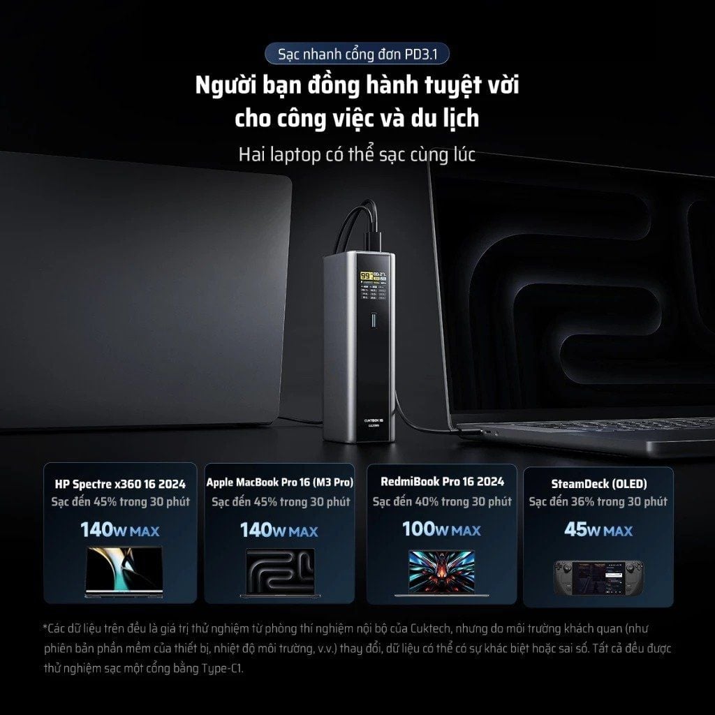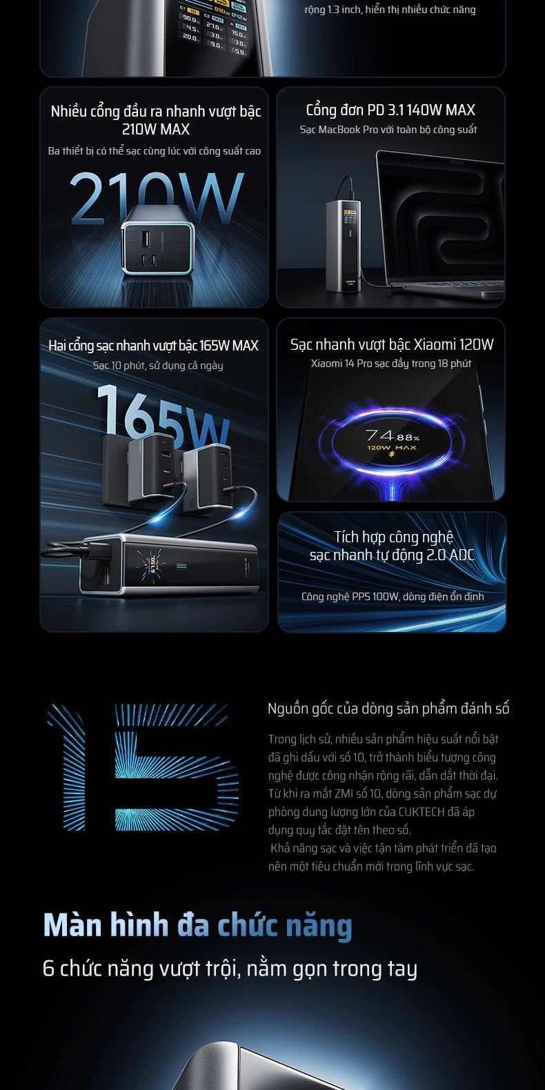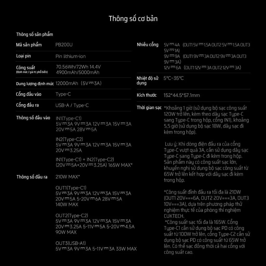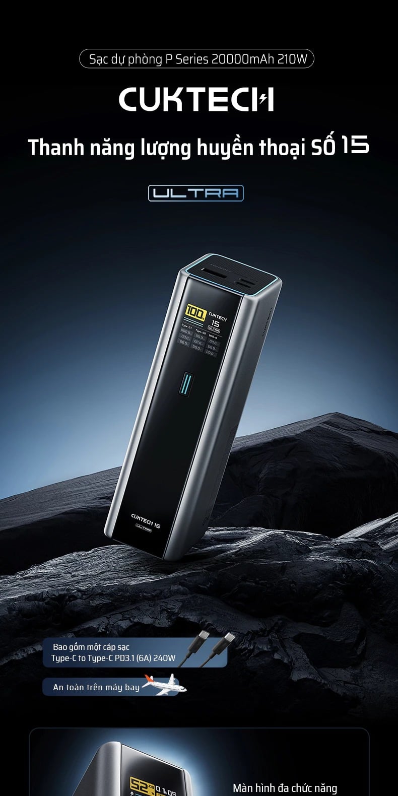 Pin Dự Phòng CUKTECH 15 Ultra 20000mAh 210W (2*Type-C + 1*USB-A, Airline Safe, 1.3" TFT Display, PD3.1, Dual input 165W Max)