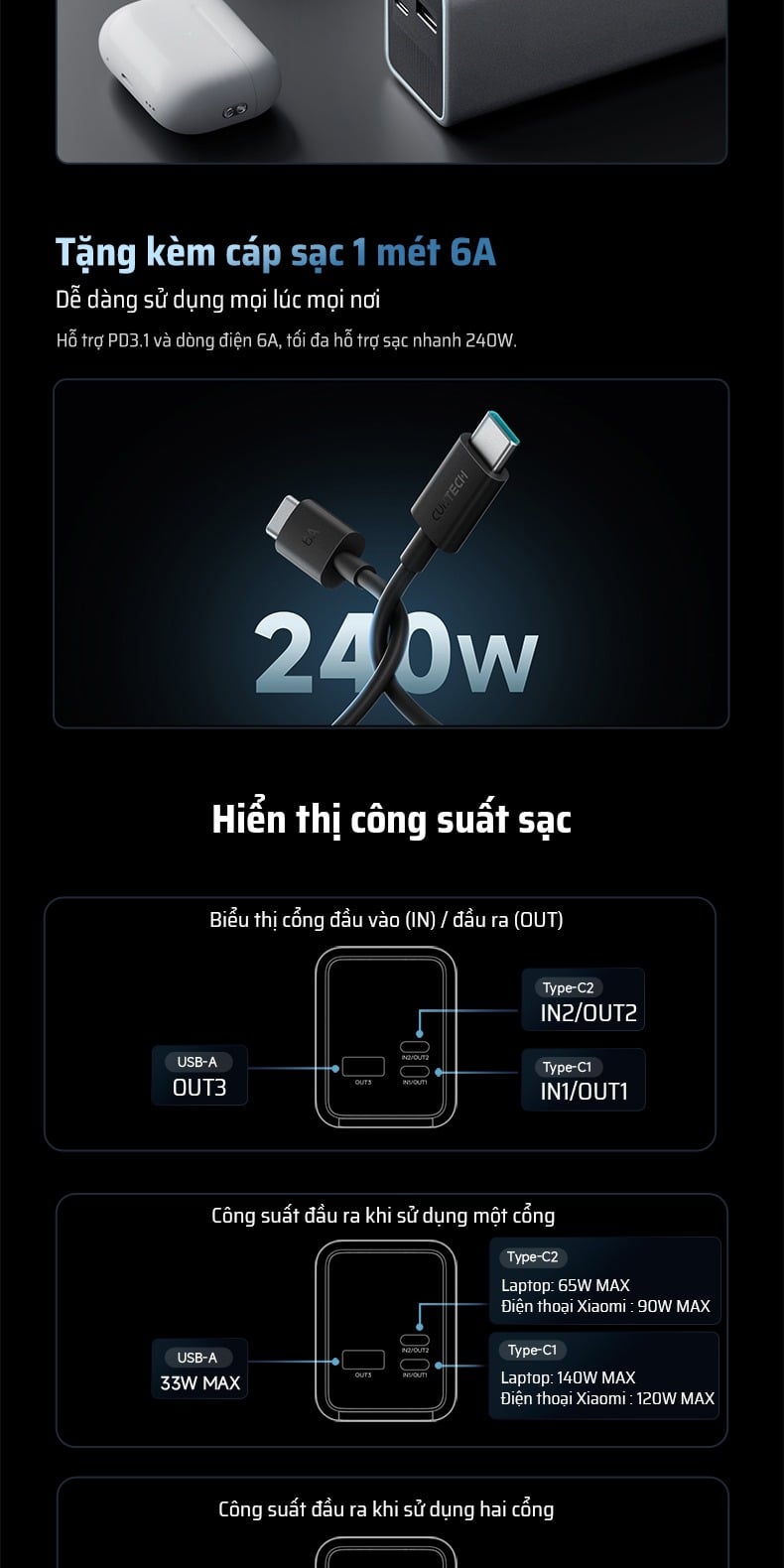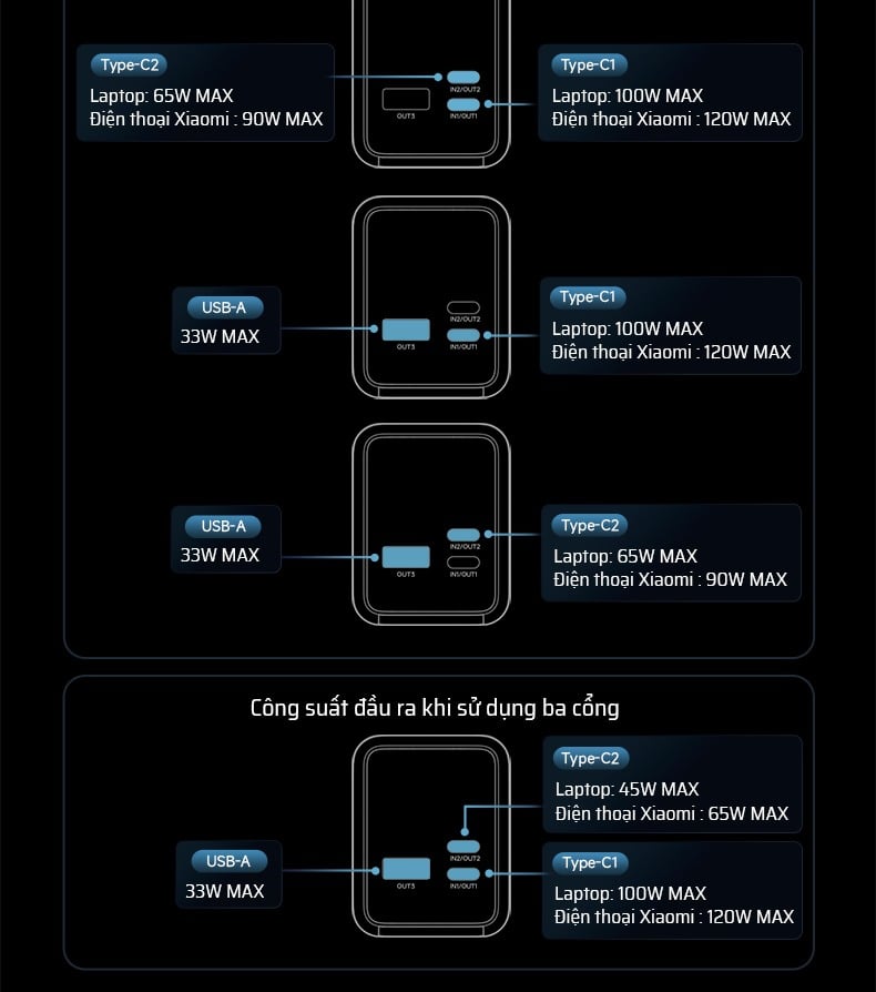 - IN1(Type-C1)+IN2(Type-C2): (20V/5A + 20V/3.25A) 165W MAX