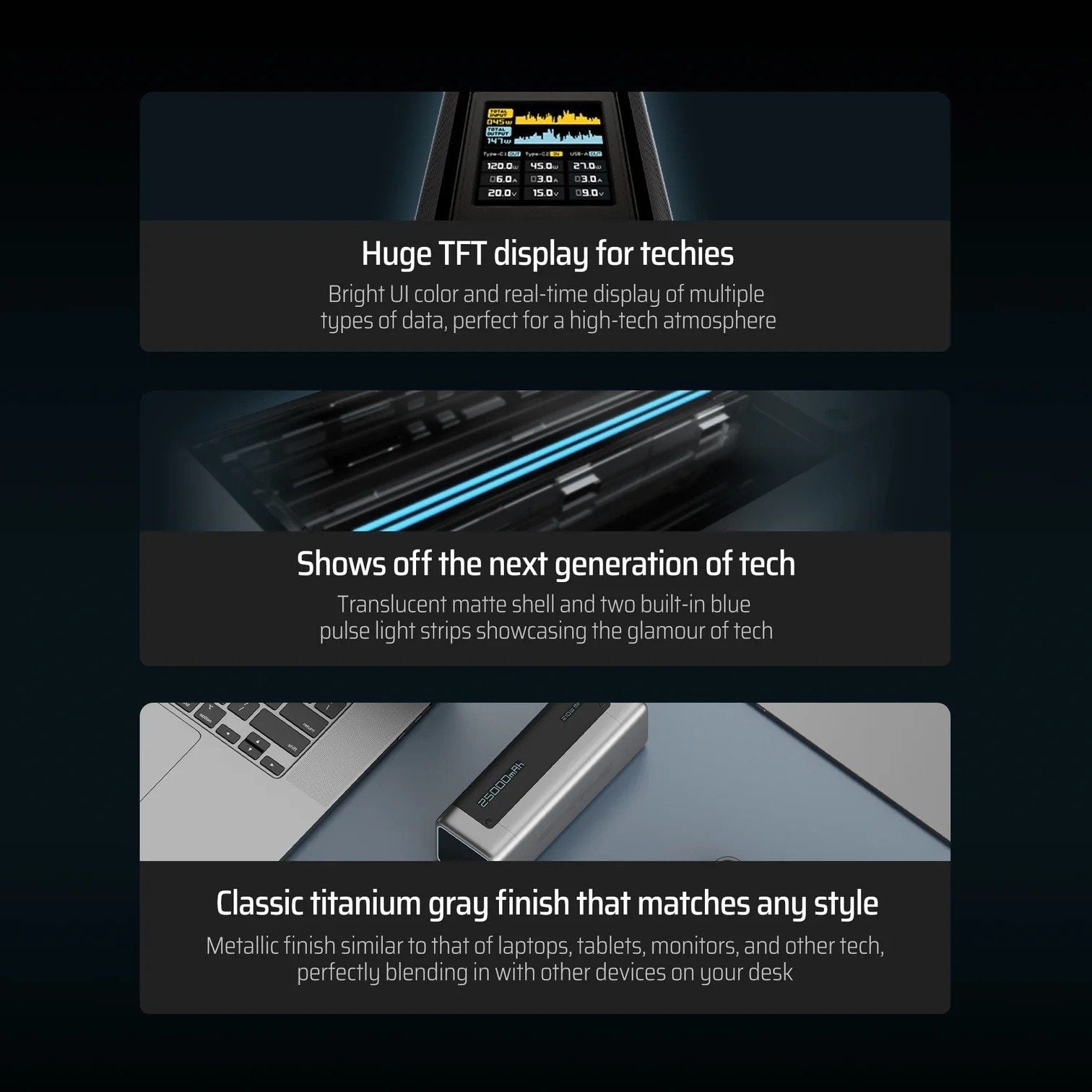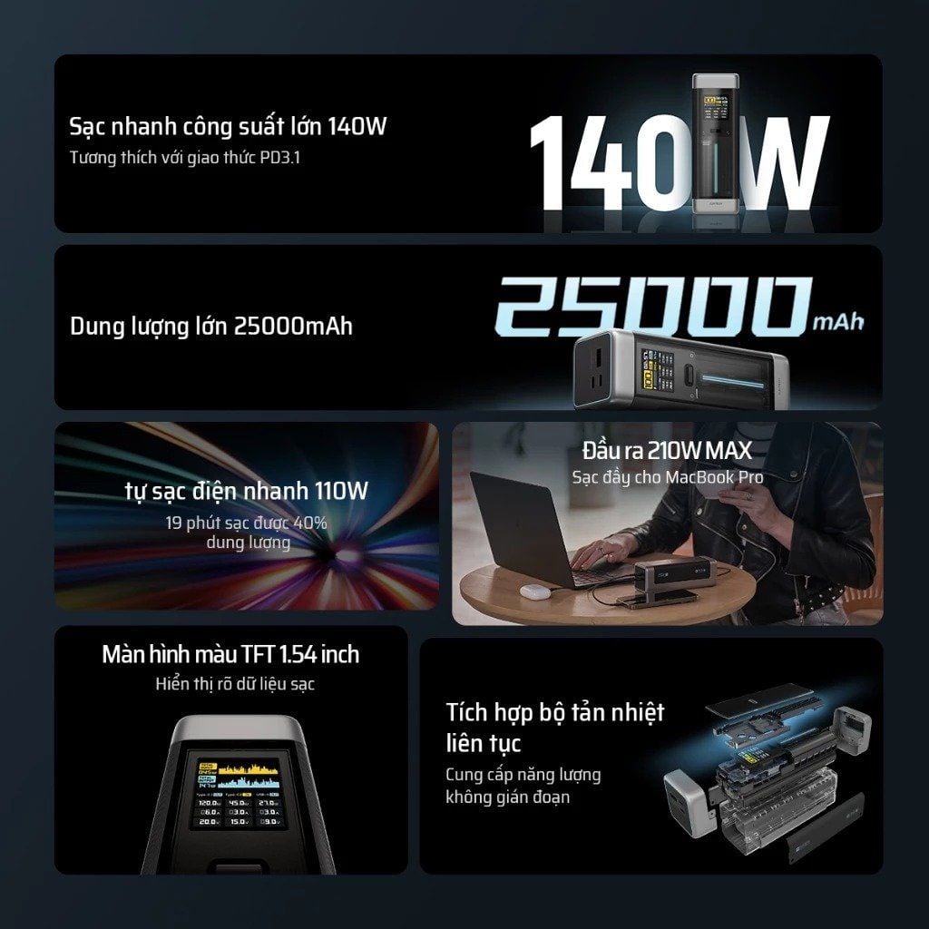 Pin Dự Phòng CUKTECH 20 25000mAh 210W (2*Type-C + 1*USB-A, 1.54" TFT Display, PD3.1, Airline Safe)