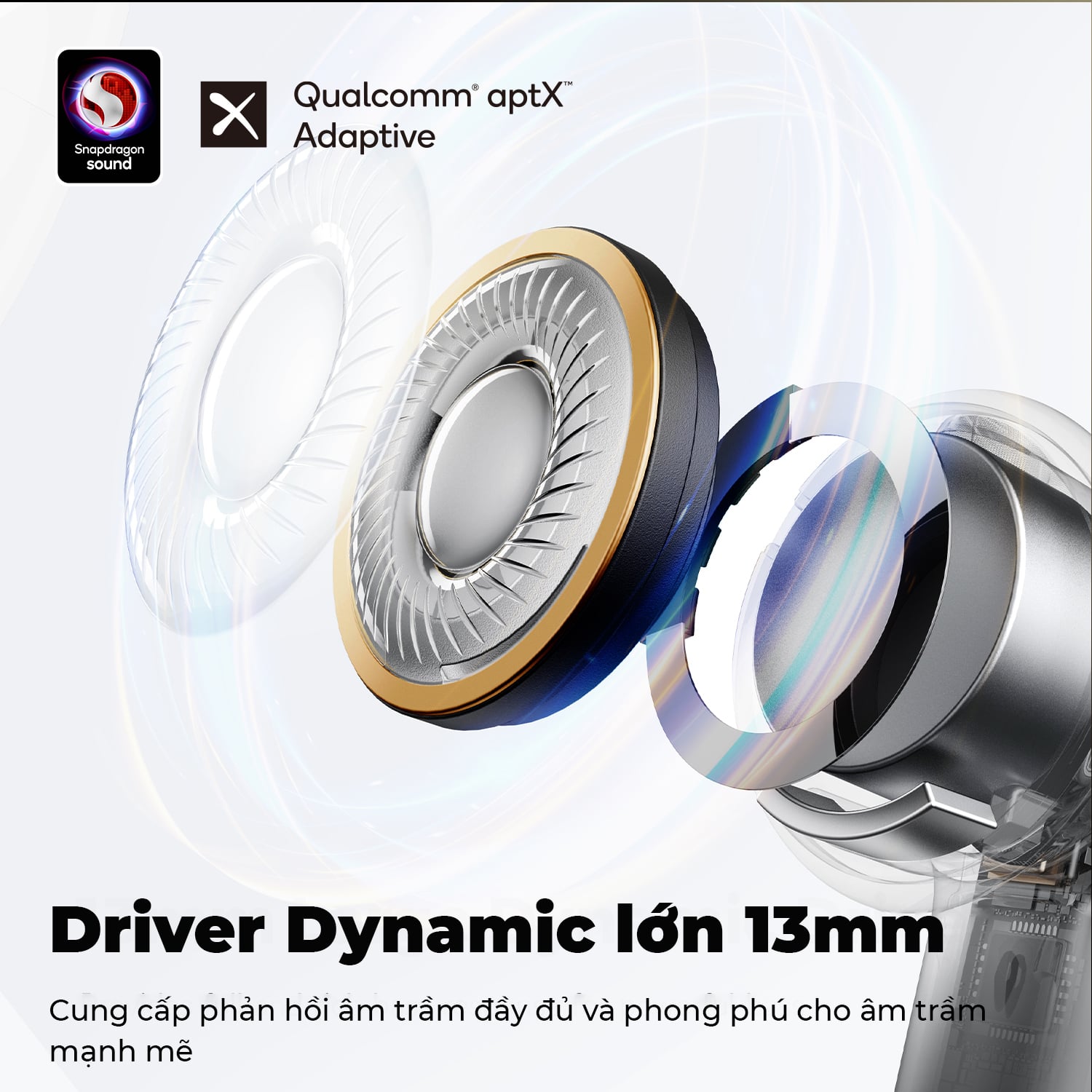 * Trải nghiệm âm thanh chưa từng có với Driver Dynamic lớn 13mm mang lại âm trầm sâu và mạnh mẽ.
