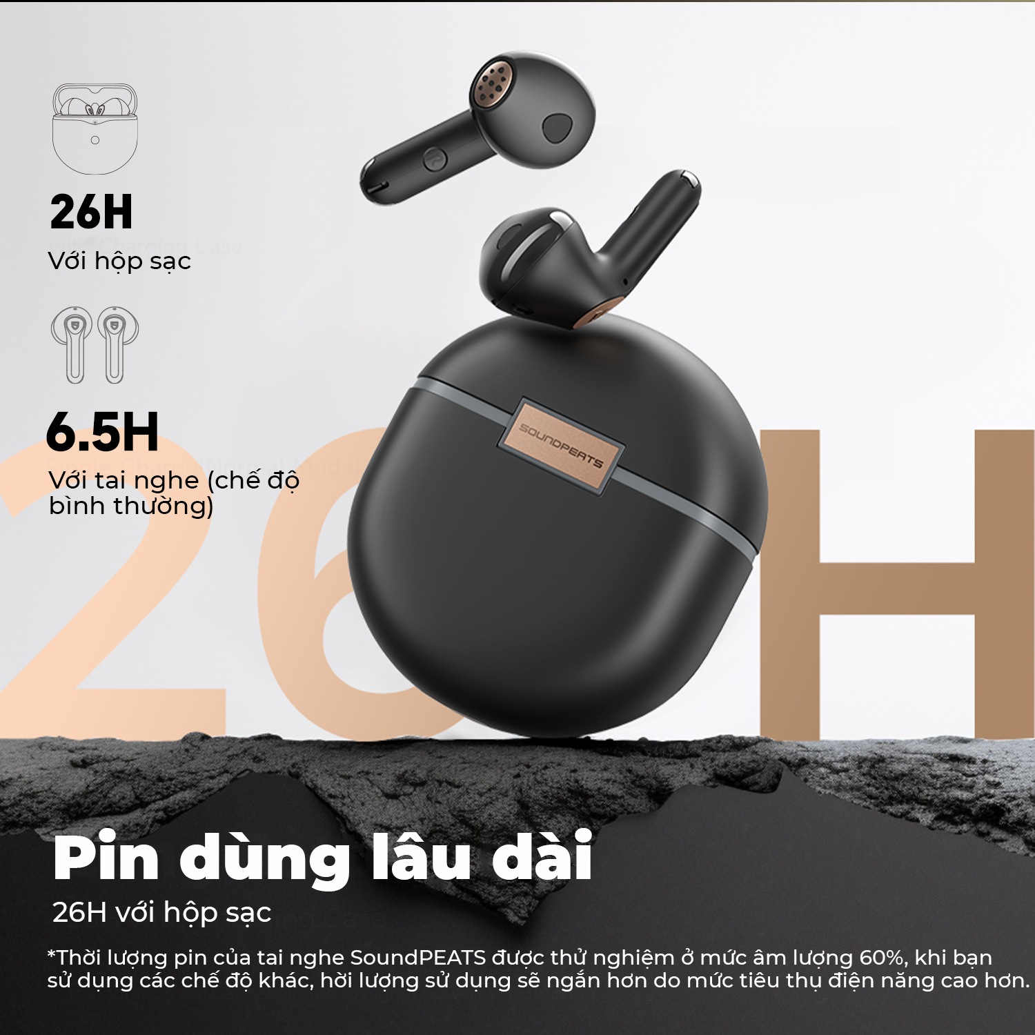 * Pin dùng lên đến 26 tiếng với case sạc, và 6 tiếng với tai nghe.